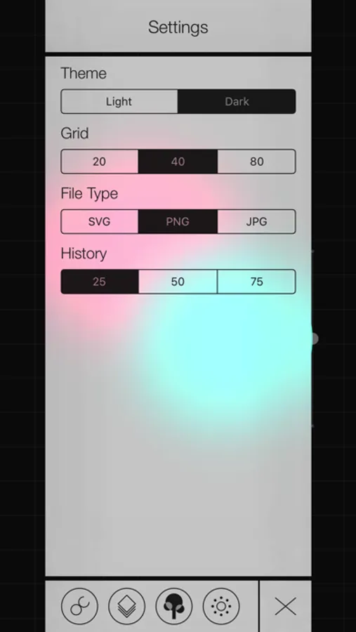 - Undo, Redo, History (shake or button to view can be set in the settings panel)