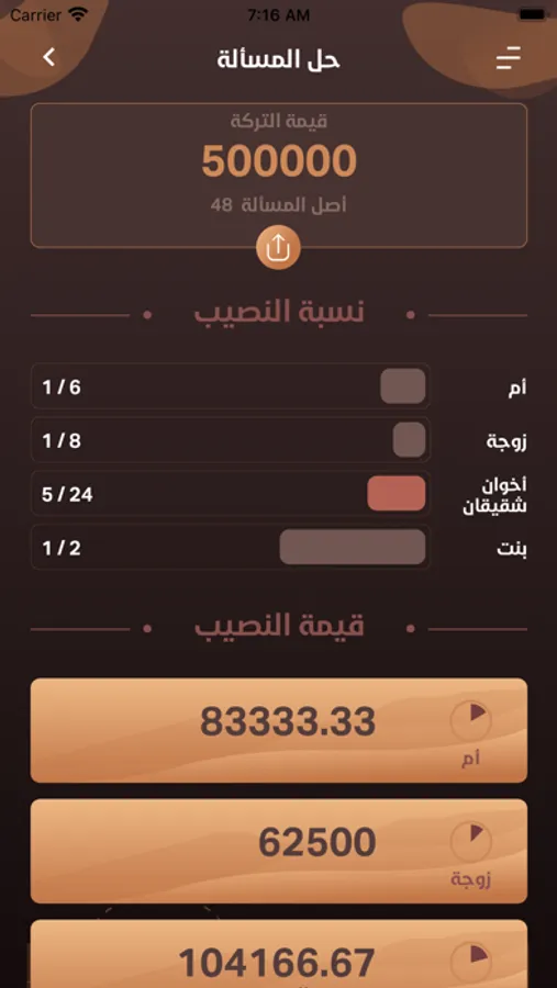 فكل ما عليك أن تقوم بإدخال البيانات الصحيحة، ويضغط على زر الحل، وستظهر لك نتيجة المسألة، مع تحليلها، مبينًا نصيب كل وارث على حدة، ونسبة هذا النصيب من التركة.