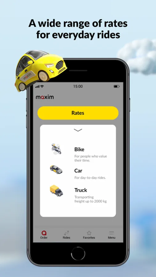 If you need a cheap taxi every day, choose our Economy rate. If you value comfort, opt for the Comfort rate. We also have minivans, buses, and trucks. You can order a delivery of food, household cleaning products and other goods or medicine from shops and drugstores.