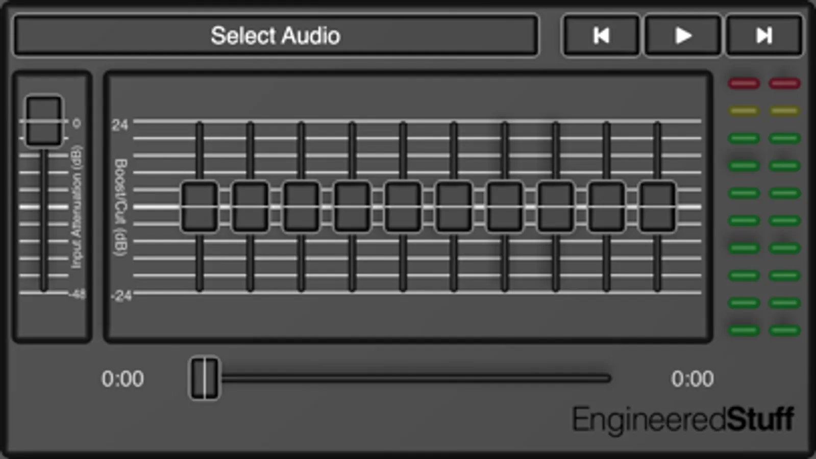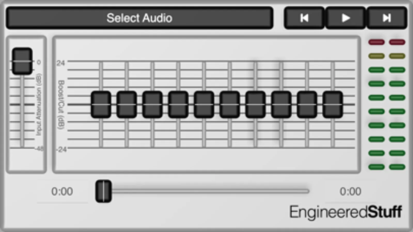 After opening iEQ, simply select the song, playlist, audio-book etc. from your Music Library, Device Files, or iCloud Drive, hit play, and move the sliders up or down until you like what you hear. The Attenuation slider on the left lets you control the overall volume and helps keeps the sound from distorting (NOTE: since the ten frequency cut/boost controls may be used to add more gain to a track already be close to "clipping", it's possible to create distortion with your EQ settings. If this occurs, remove the distortion by lowering the overall signal level with the attenuation control).