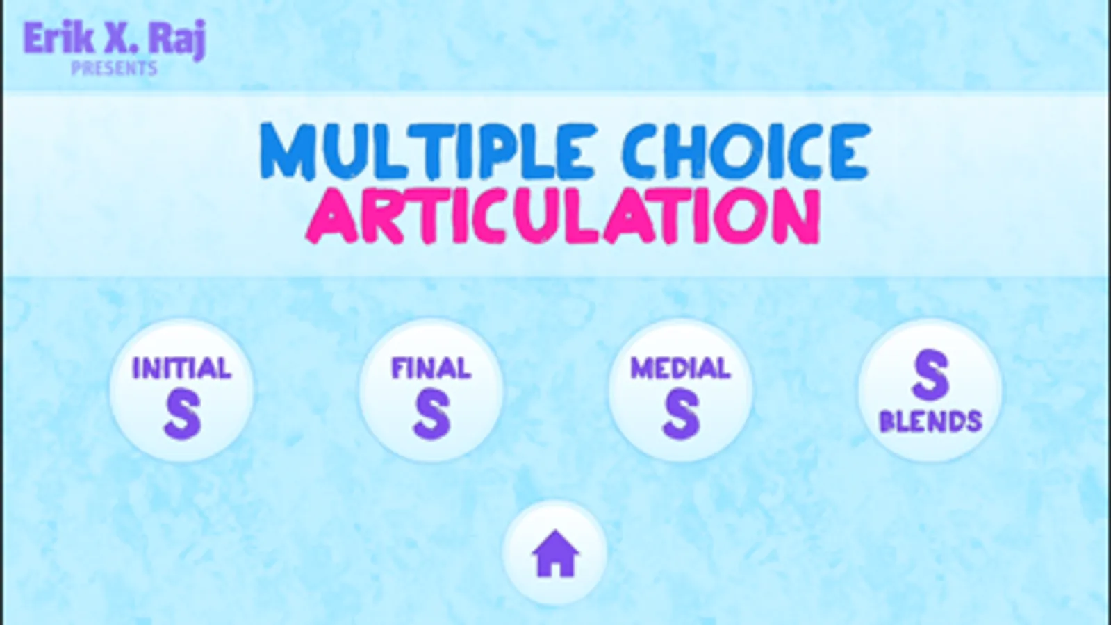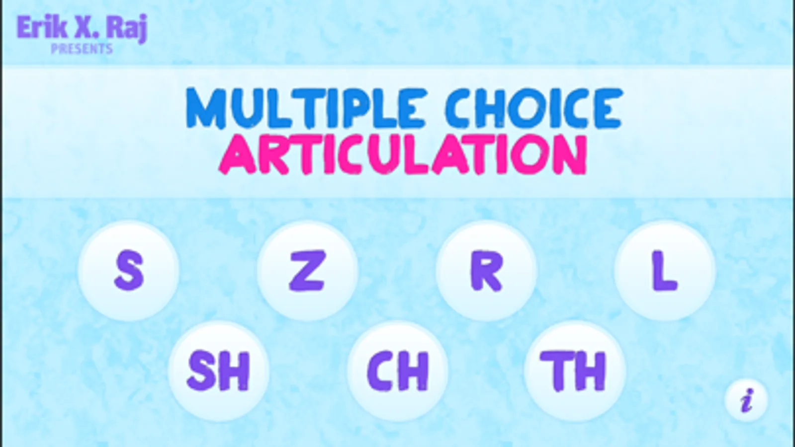 Created by Erik X. Raj, M.S., CCC-SLP, Multiple Choice Articulation is an interactive app for your iPad, iPad mini, iPhone, and iPod touch that features a collection of over 500 multiple choice questions designed for speech-language pathologists to use with individuals who exhibit difficulty producing the following speech sounds: S, Z, R, L, S/R/L Blends, SH, CH, and TH.
