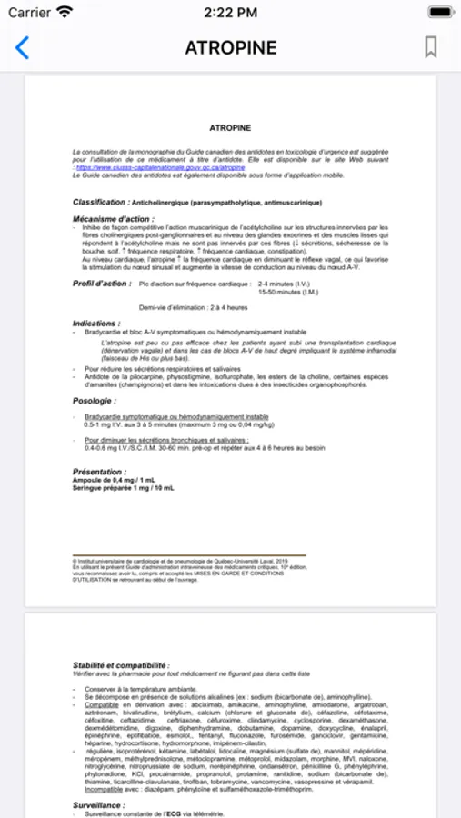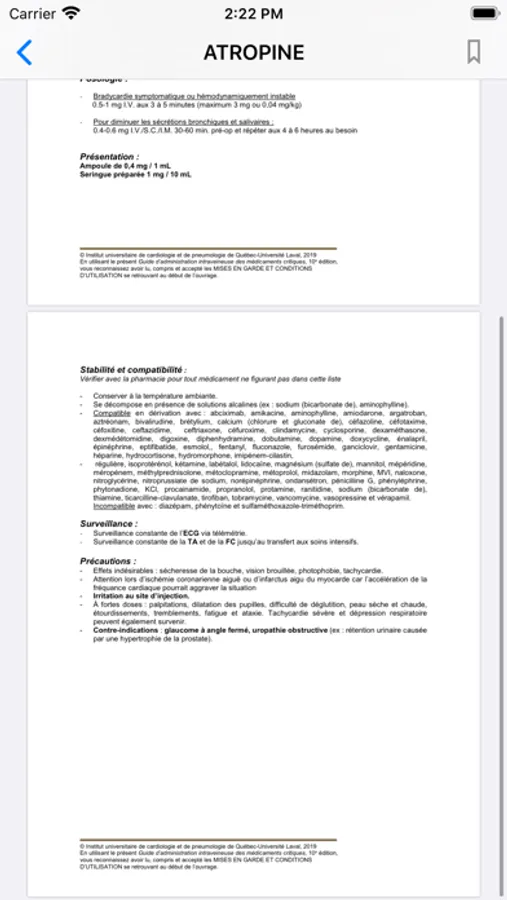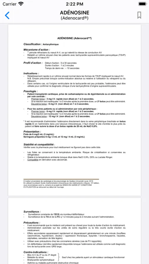 Le Guide d’administration intraveineuse des médicaments critiques se veut un ouvrage de référence pratique et facile à consulter pour les médecins, pharmaciens, infirmières et infirmiers qui sont impliqués dans l’administration intraveineuse des médicaments critiques. Le guide comprend une soixantaine de médicaments parmi les plus utilisés en soins critiques. Chaque fiche de médicament fourni de l'information sur la classification, le mécanisme d'action, le profil d'action, les indications, les posologies, les présentations disponibles à l'IUCPQ, les données de stabilité et de compatibilité et les précautions, en plus de tableaux de perfusion pour plusieurs médicaments. L'utilisateur doit toutefois prendre en considération que le guide a d'abord été créé par et pour les professionnels de la santé de l'IUCPQ avec les particularités propres à ce milieu ultraspécialisé. L'utilisation du guide doit faire l'objet d'adaptations en fonction du milieu.