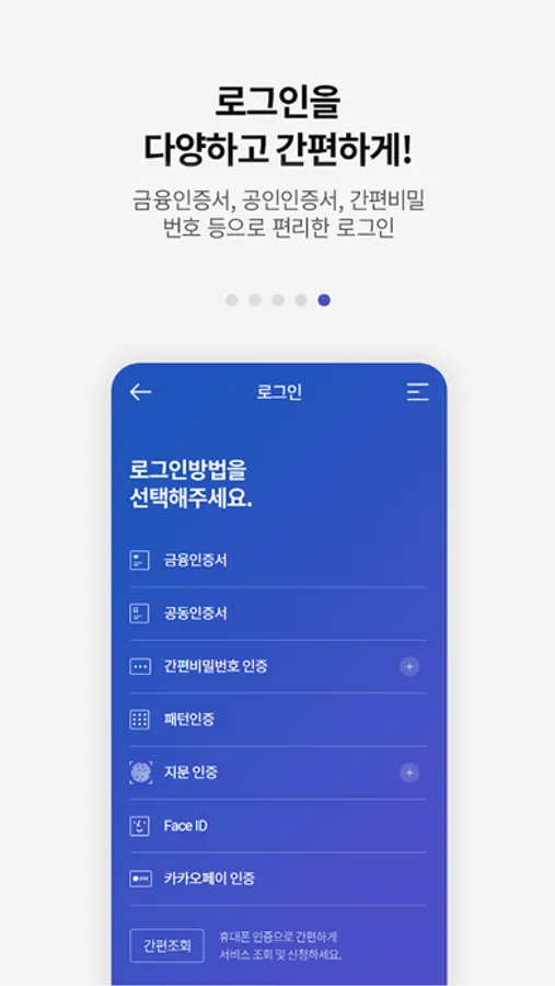 최초 로그인 후 간편(PIN)번호 인증, 지문인증, 카카오페이 인증으로 다양하고 편리하게 로그인 가능합니다.