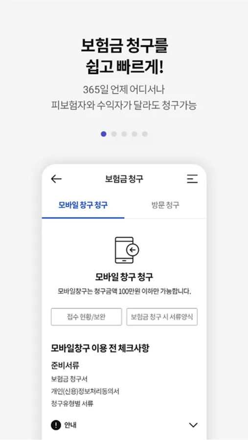 사고 보험금 청구 및 심사, 지급 내역 조회 (피보험자와 수익자가 달라도 모바일로 신청 가능)
