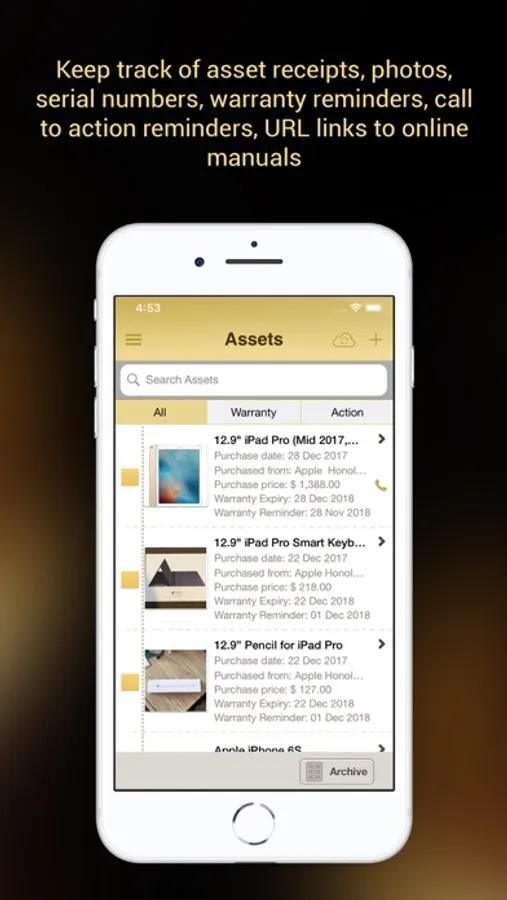 * Tag and manage assets on the go and set push reminders for selling, revaluation, replacement, lending, donating and servicing your assets e.g. set reminder to service your car