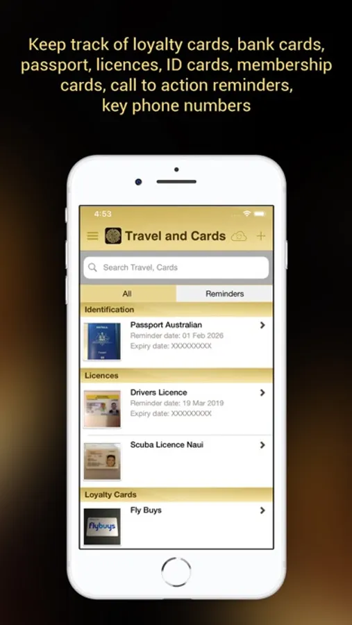 * Quickly photograph/capture details of your travel wallet cards/documents for peace of mind when you are away from home (e.g. passports, loyalty cards, frequent flyer cards, licences, bank cards)