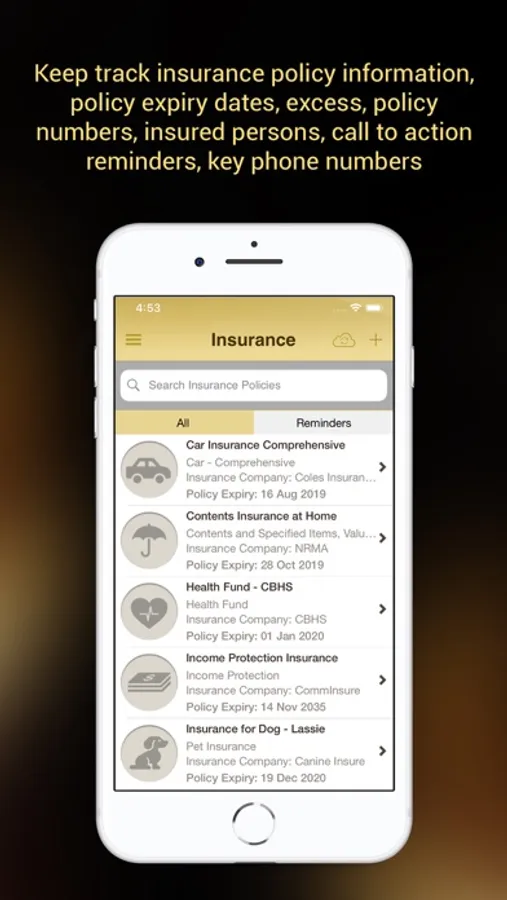 * Quickly record key insurance policy details in one place - policy numbers, policy start and end dates, insurance company and contact phone numbers, tag personal possessions against insurance policies to estimate insurance coverage and check you are not UNDERINSURED.