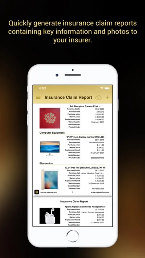 * Create onscreen and PDF reports for insurance, warranty and tax claims and save PDF reports to cloud storage apps