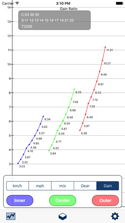 By switch ON/OFF the display of each inner / center / outer gear, you can simulate the optimal gear ratio.