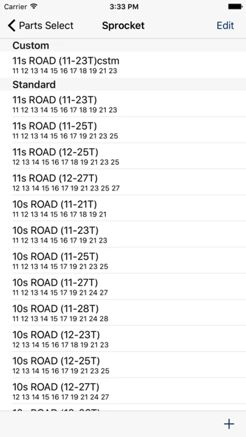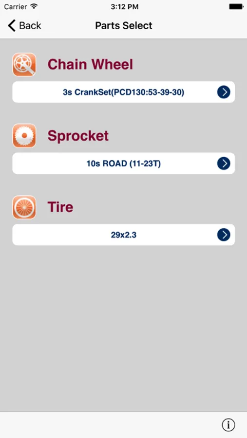 Calculates and displays the gear ratio from each position of the selected chain wheel and sprocket.
