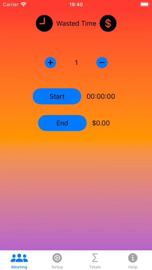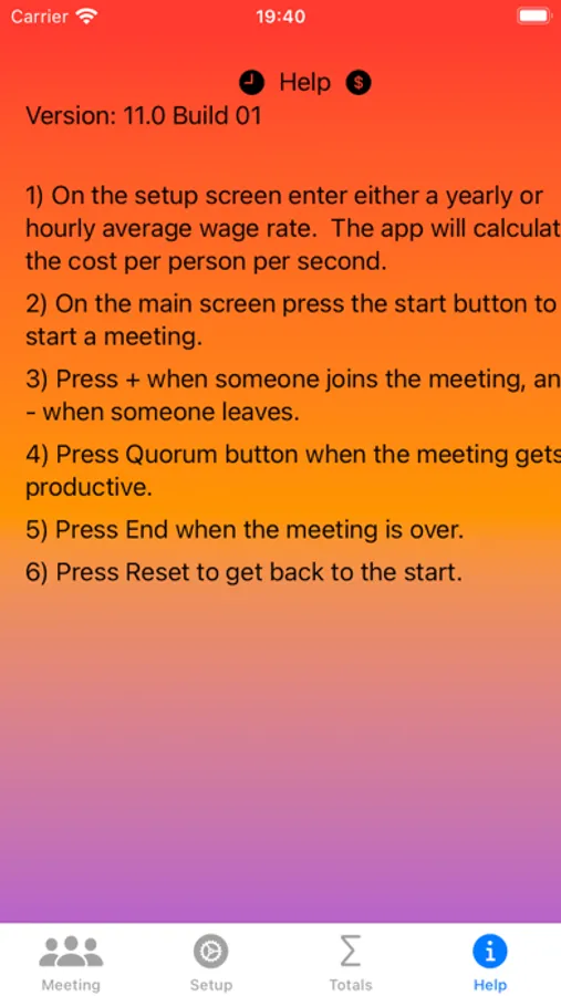 Enter an average hourly or yearly salary for those invited to your meeting. As each person joins you simply tap one button and watch the cost increase until a quorum is reached.