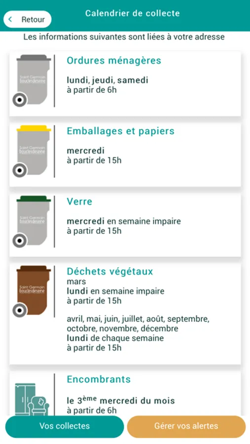 En renseignant précisément votre adresse, vous obtiendrez vos jours et heures de collecte de manière personnalisée, et ce pour chacun des flux de déchets : emballages et papiers, verre, encombrants, déchets spéciaux et toxiques, déchets végétaux et ordures ménagères.