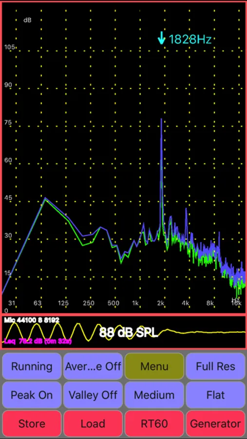 Features 1/1, 1/3 & 1/6 octave RTA modes, Leq, RT60 (wideband, and Octave), spectrogram, peak frequency, Fast, Medium & Slow filters, Flat & A/C Weighting, Averaging, SPL Chart Recorder, Noise Criteria (NC), White/Pink Noise, Sine, Square, Triangle, Sweep, Ramp and Impulse signals & loudspeaker polarity checker. Frequency spectrum store & load, RT60 store, and Chart store. Stored files can be sent as Email.