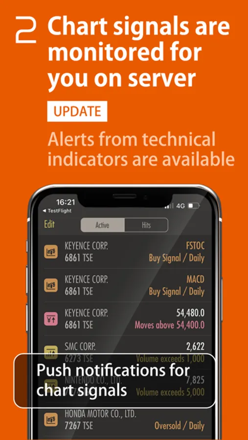 Server-based push notifications for signals from technical indicators.