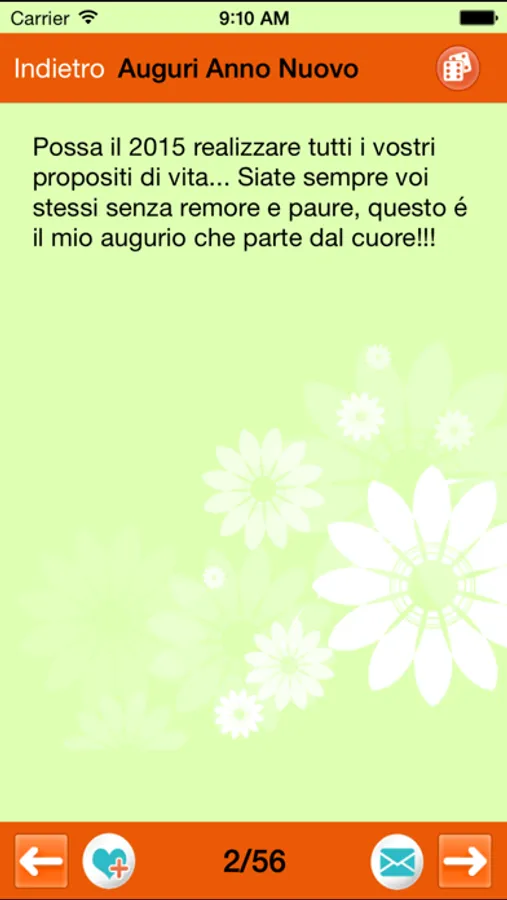 Nella nostra applicazione troverai tanti auguri per varie occasioni come Natele, Capodanno, Compleanno, Festa della Mamma e altri. Ricordati di mandare gli auguri ai tuoi parenti o amici. Con la nostra applicazione puoi facilmente mandare gli auguri via e-mail, SMS o Facebook!