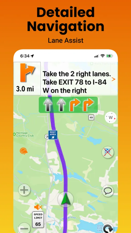 * Provides turn-by-turn instructions with voice with lane guidance.