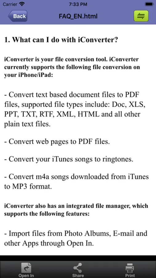 - Import files from Photo Albums, E-mail and other Apps through Open In.
