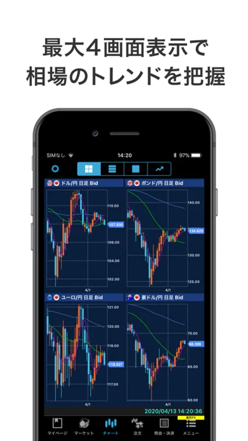 By displaying 4 charts simultaneously, you can compare price movements and grasp market trends. By parameting the settings of technical indicators you can display high-performance charts on par with PC-like quality charts.