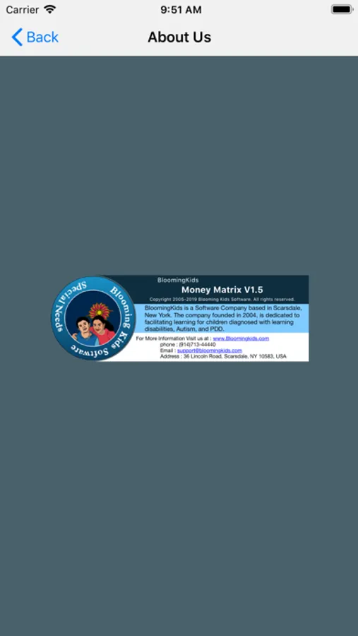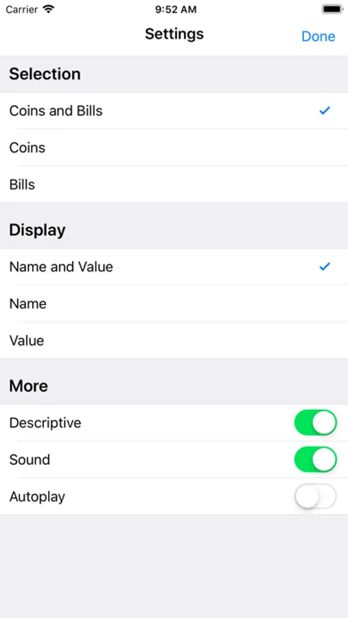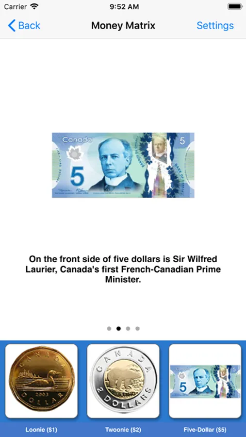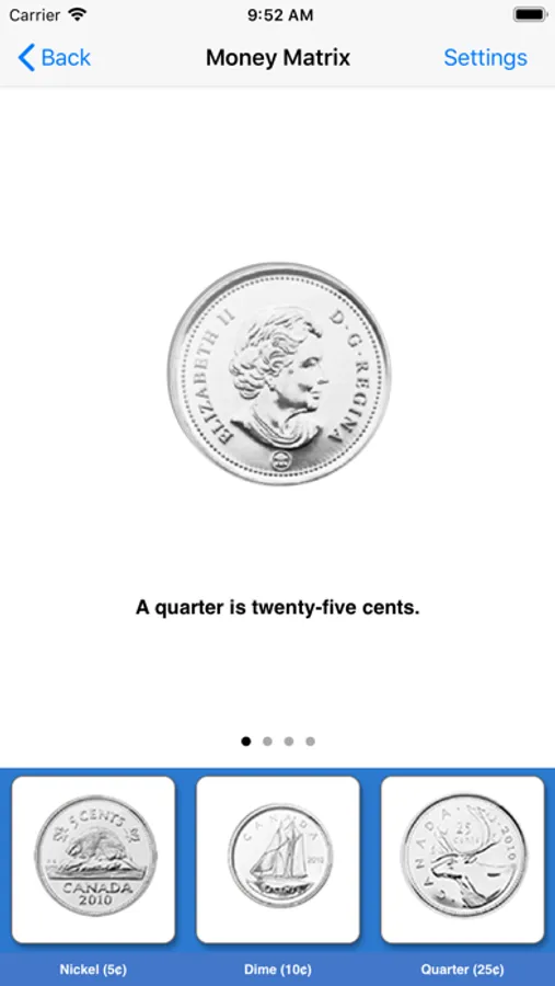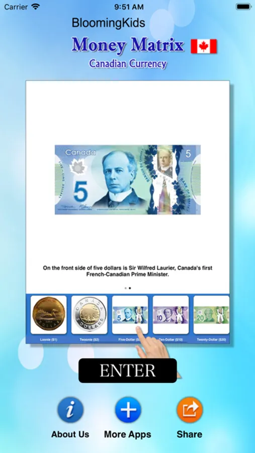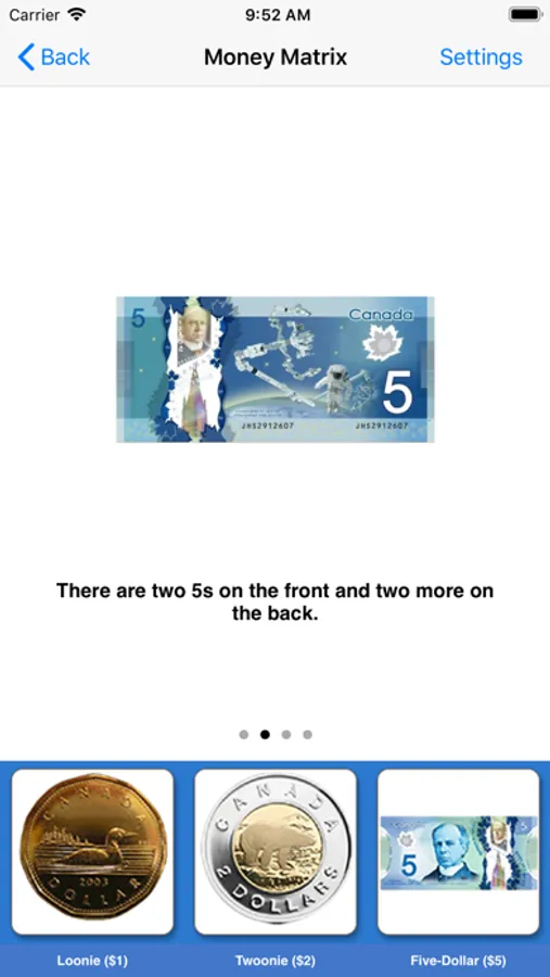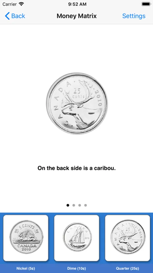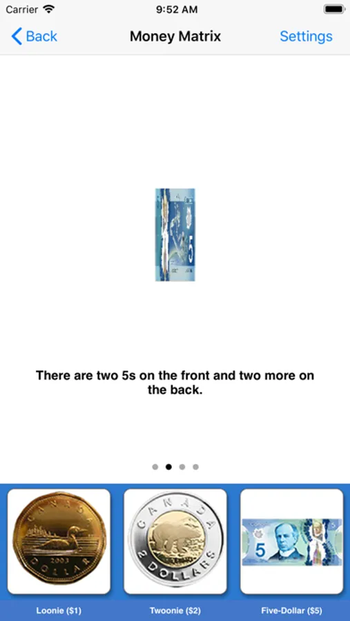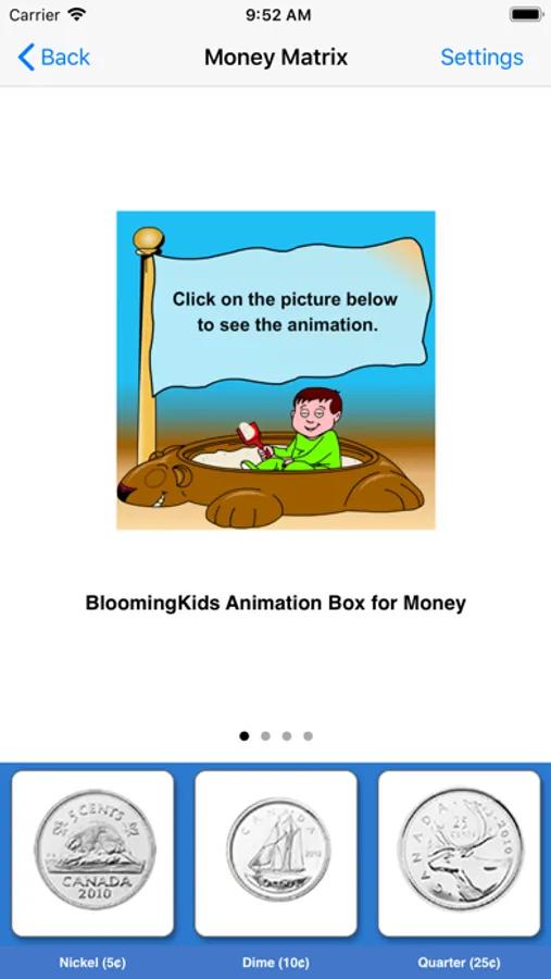 Here, seven coins (nickel, dime, quarter, one dollar and two dollar) and five bills ($5, $10, $20, $50 and $100) appear at bottom of the screen. When the user touches the picture of a coin or bill, another picture of the coin or bill appears in the middle of the screen. The picture of the coin or bill rotates so that both the front and back can be seen. It describes the front and back side of each coin or bill. It will help students to memorize the coins and bills.