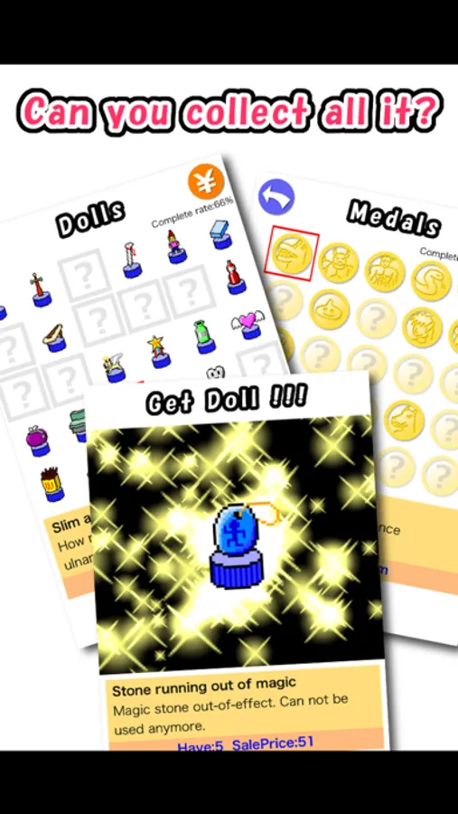 * Collect medals and dolls to strengthen your hero.