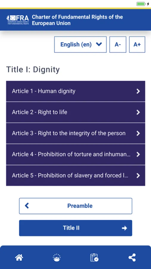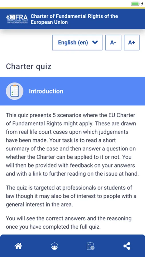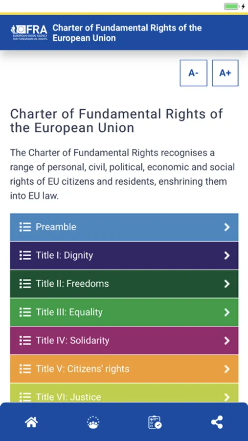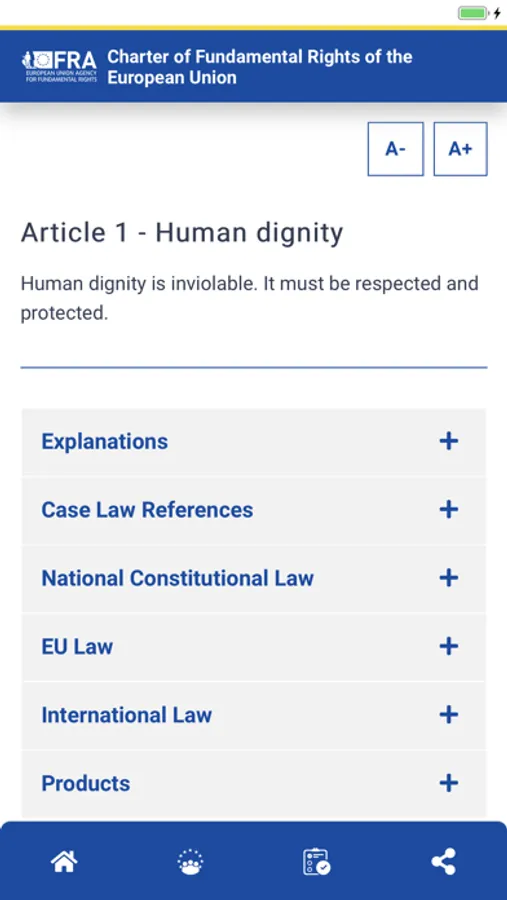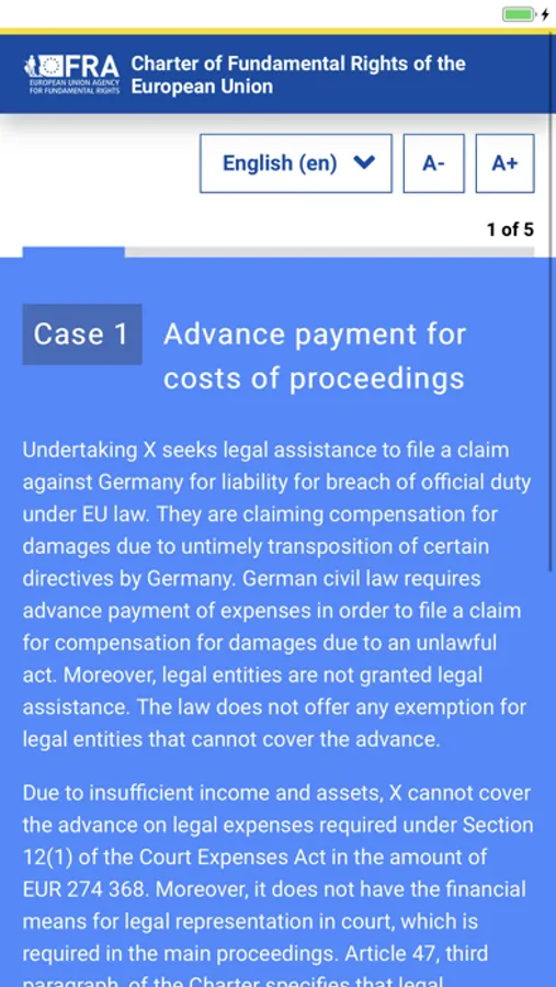 It offers easy access to the text of the Charter of Fundamental Rights of the EU in all official languages in a mobile-friendly format. It also provides regularly updated information on an article-by-article basis on related EU and international law, European Court of Justice (ECJ) and European Court of Human Rights (ECtHR) case law and a selection of national case law that refer directly to one of the Charter articles as well as related FRA publications.