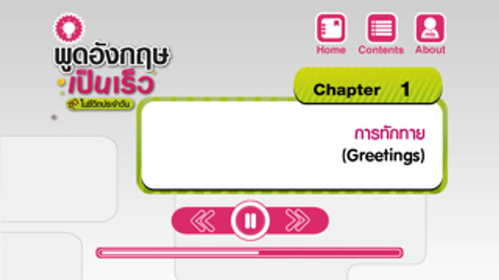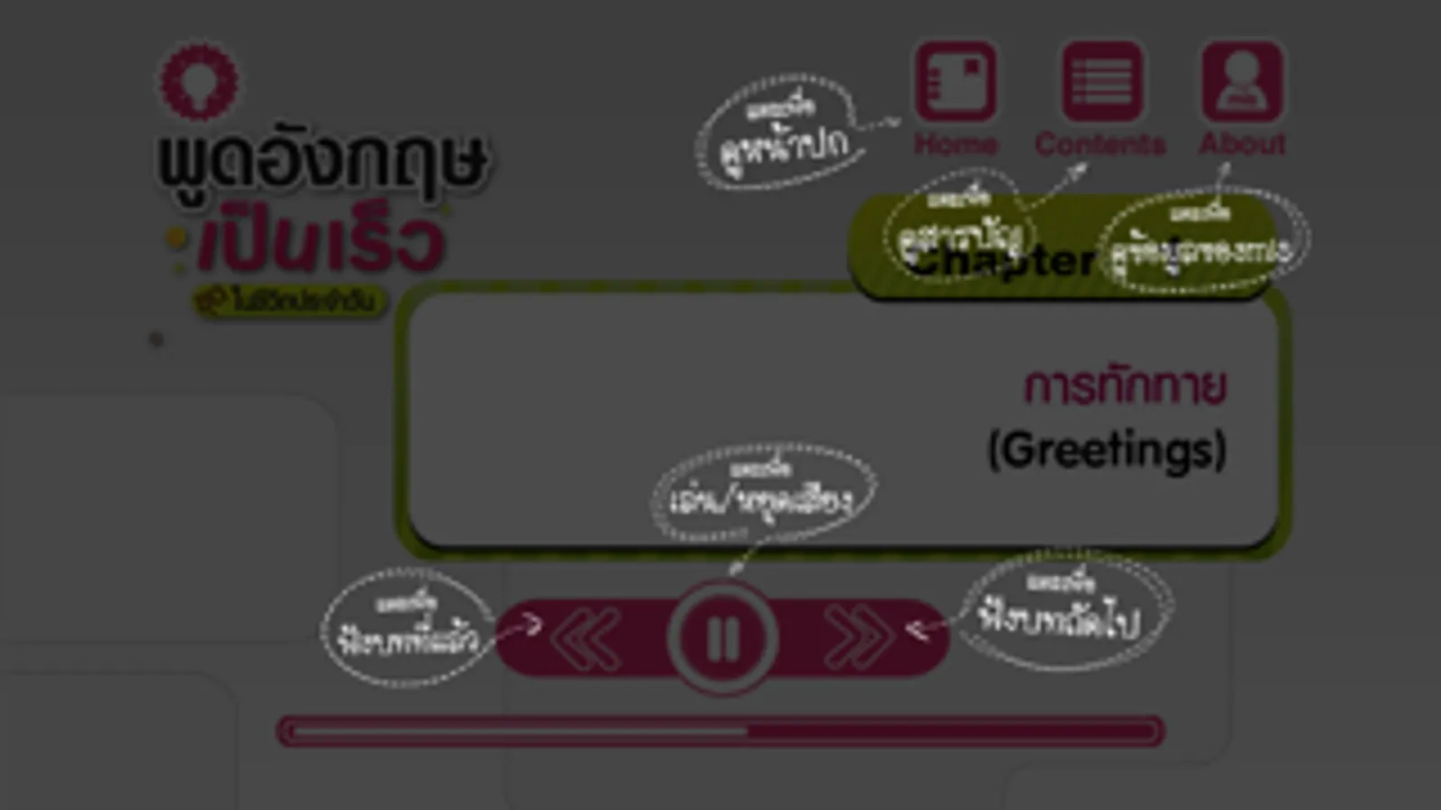 App สำหรับฟังเสียงประโยคและบทสนทนาโดยเจ้าของภาษา (Native Speaker) ฟังและฝึกออกเสียงตามได้ทันที ใช้ร่วมกับหนังสือ "พูดอังกฤษเป็นเร็ว ชุดในชีวิตประจำวัน"