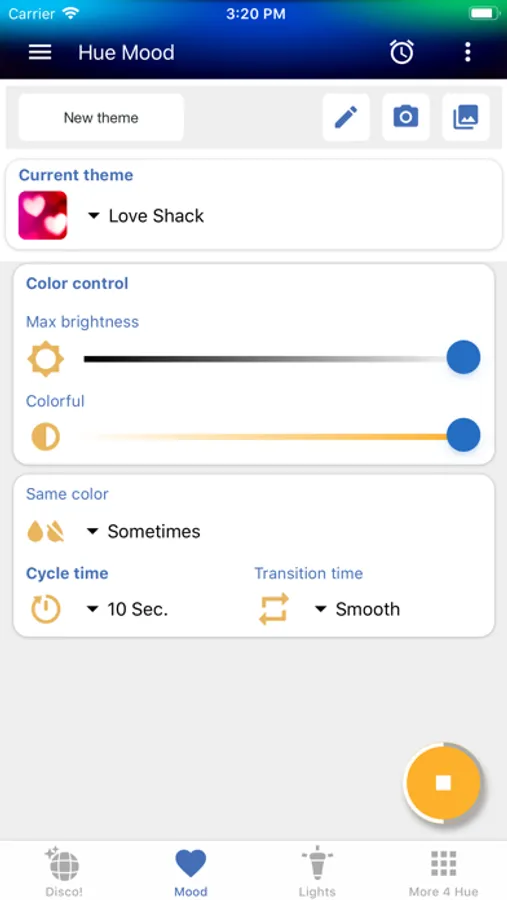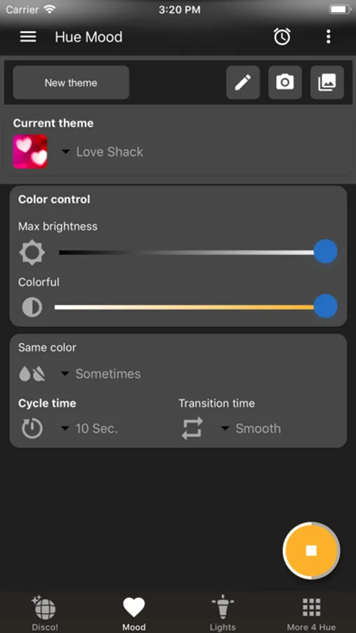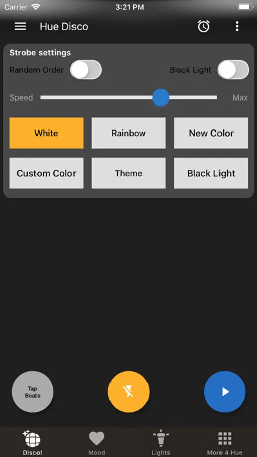 Hue Disco does it all with your Philips Hue setup. The Mood function changes your Hue Lights within a themed colorset at your chosen time interval over and over again. Perfect for warming up your party or any other occasion.