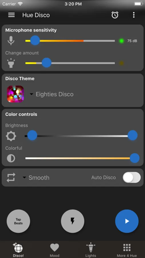 Hue Disco is the best in recognizing your favorite music through the microphone. Even at low volume levels changes are accurately detected and transformed into a lightshow. It's the only Hue App with a real fast Stroboscope! (Strobe)