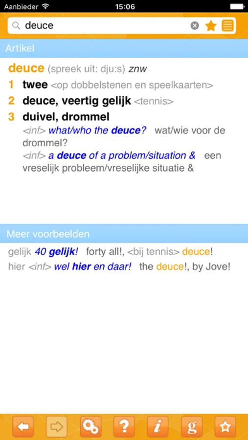 •Je hoeft niet zelf te kiezen voor Engels of Nederlands; de app kiest automatisch de juiste taal; Nederlandse woorden hebben in de index een oranje achtergrond, de woorden van de vreemde taal een blauwe achtergrond.