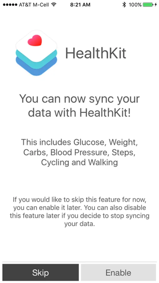 Integrate your data with HealthKit, including Glucose, Weight, Carbs, Blood Pressure, Steps, Cycling and Walking.