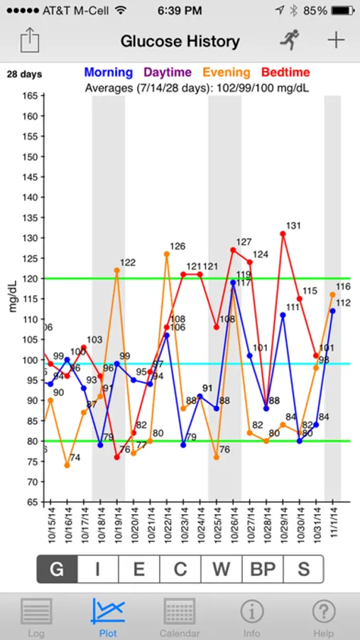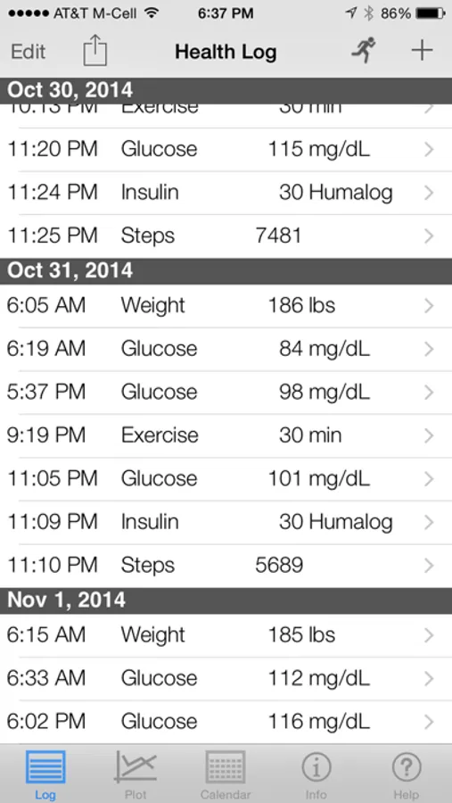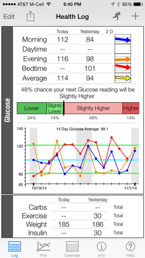 Currently, you can plot Glucose, Insulin, Exercise, Carbs and Weight, which helps you visualize trends in your health. The Plot features: