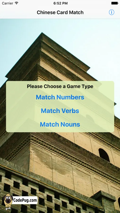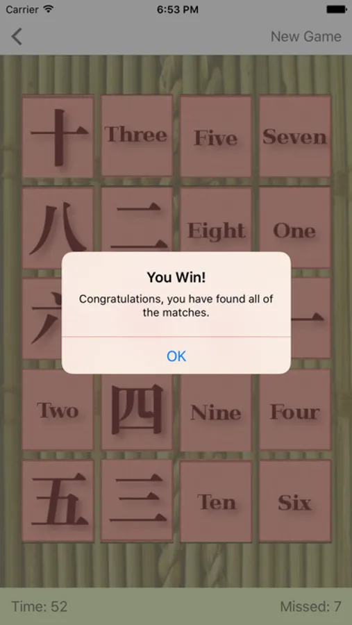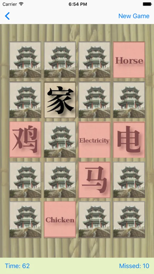 With 30 different characters including numbers, verbs, and nouns you will be off to a good start in no time. Simply pick a card by touching the screen and then find its English equivalent. Good luck, it's timed!