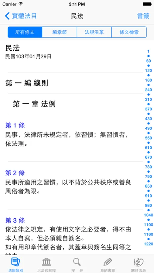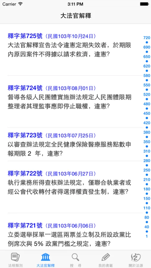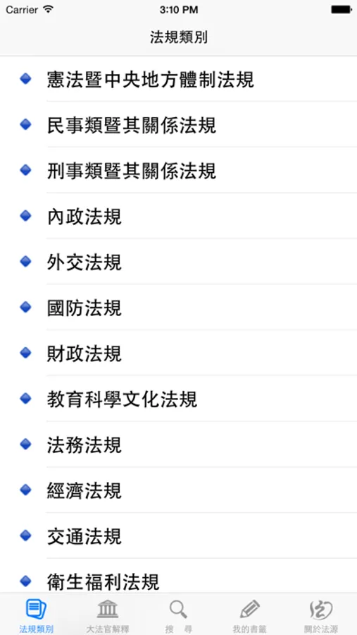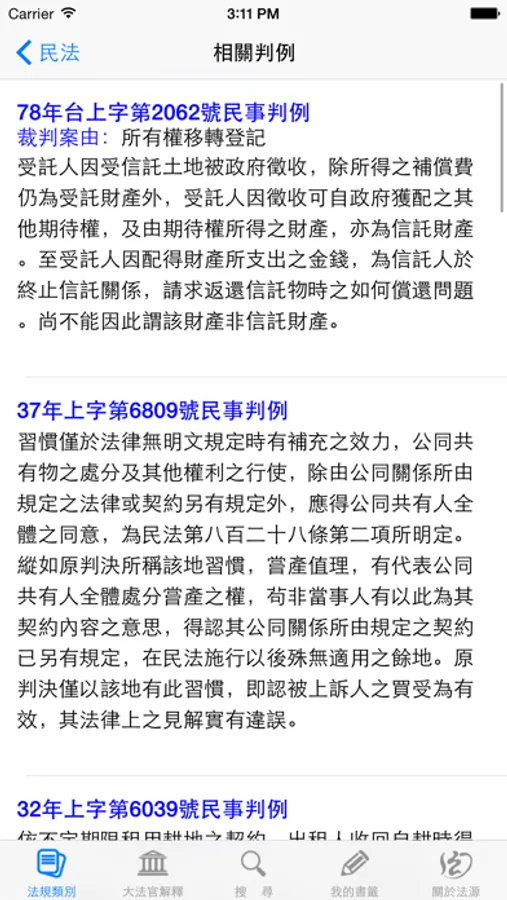 收錄「全國法規資料庫」中,全部法規、條約協定、大法官解釋、最高法院民事判例、最高法院刑事判例、最高行政法院判例…等資料計約2萬餘筆,為最專業、即時的法規資料庫。現階段免費下載,歡迎使用。