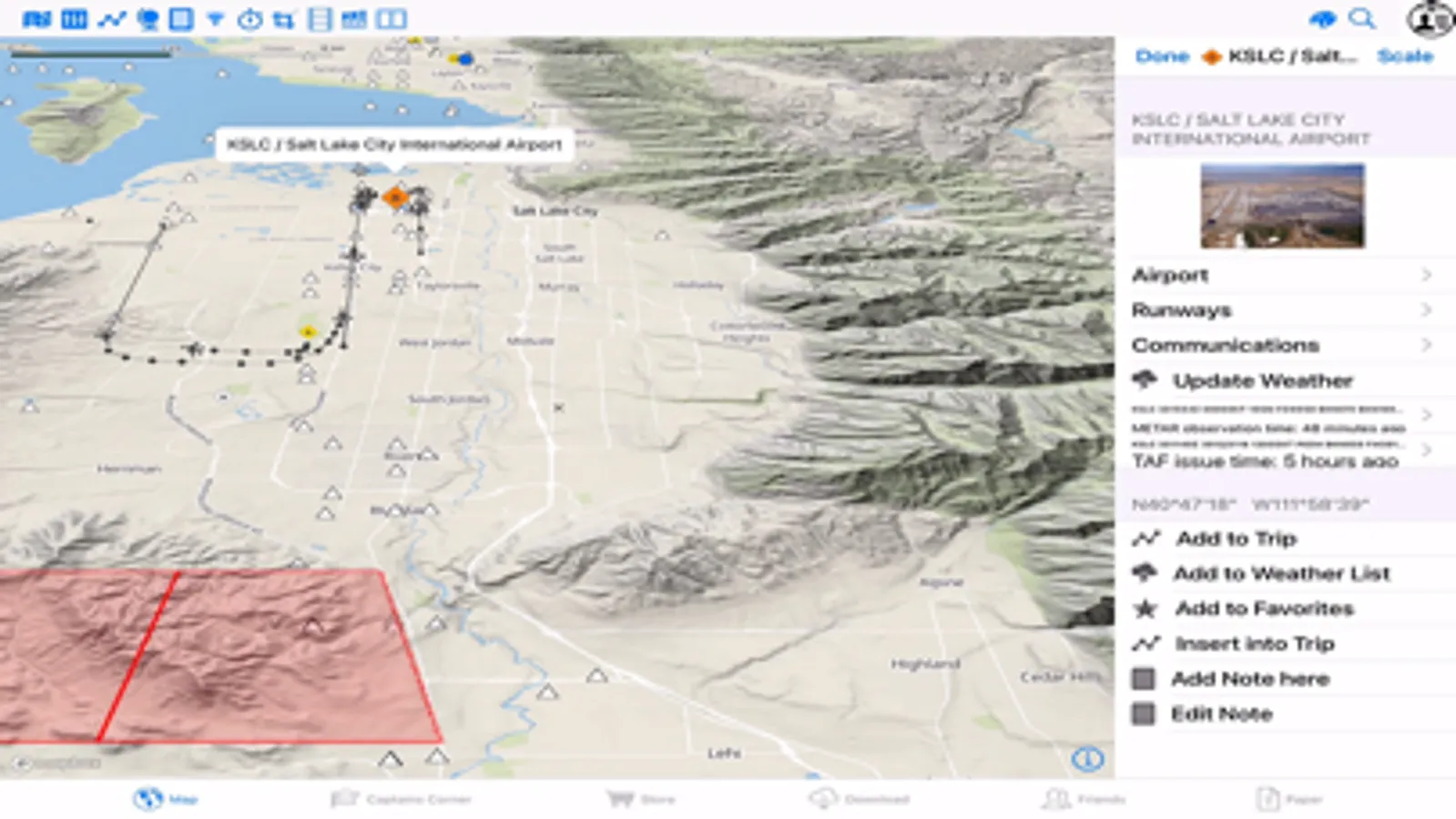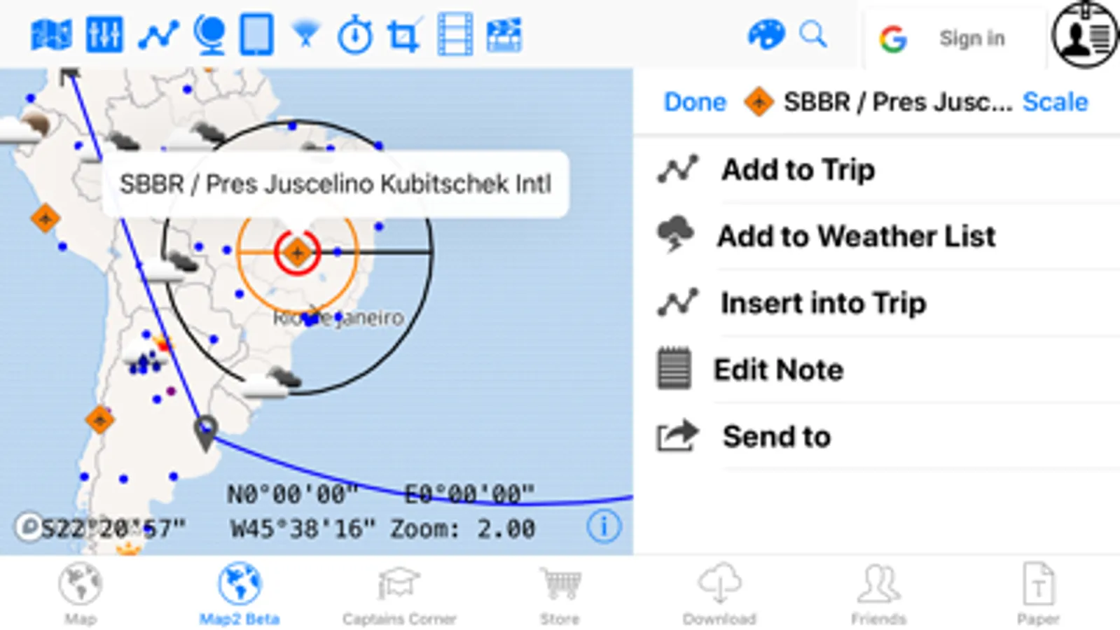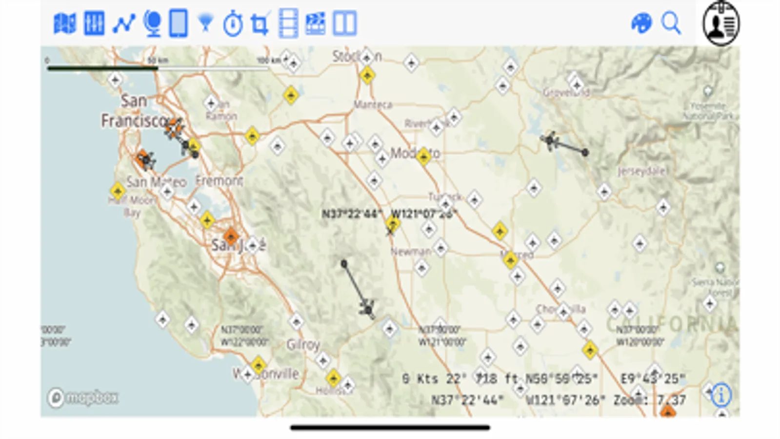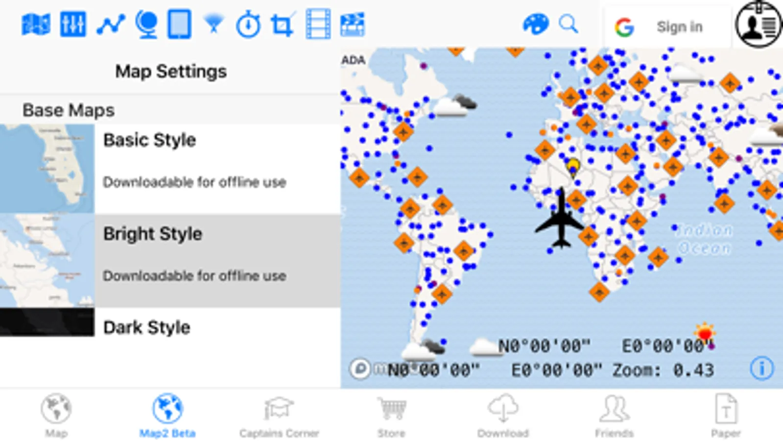 Create your own map style, many different map layers and different databases (aeronautical / navigation-aids and Points of Interest´s etc.). Insert, store and/ or edit your flight planed route by using ICAO/ IATA-codes, waypoints, VOR´s NDB´s or Lat/ Long. Find positions with a separate Lat/ Long finder.