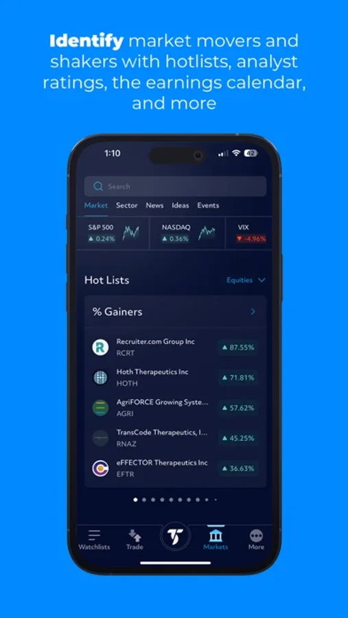• Dynamic “Markets” section with features like pre-built hotlists, news summaries, sector ETFs, analyst ratings, earnings calendars, and more