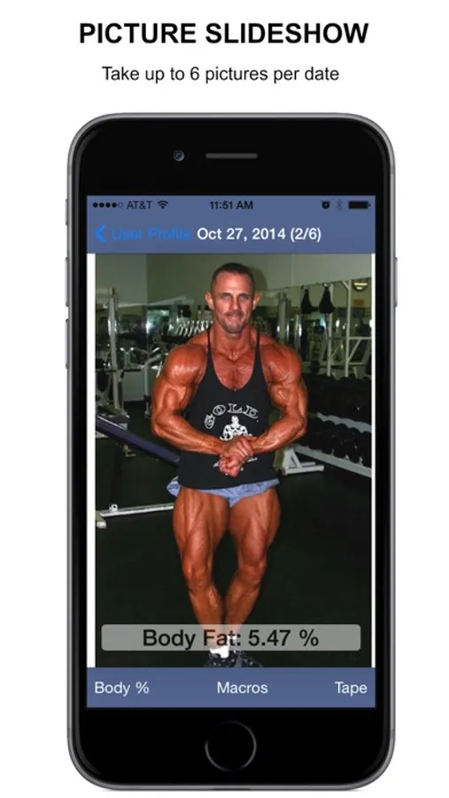 Body Tracker provides a detailed diagram and video showing exactly how to calculate your body fat percentage with a fat caliper or tape measure. Just click on the camera or video icon, and you will see a diagram or video showing the exact locations to measure with your body fat caliper. If you're using a tape measure, Body Tracker explains how to take those measurements. Even if you've never done it before, Body Tracker will explain how to accurately and easily calculate your own body fat percentage.
