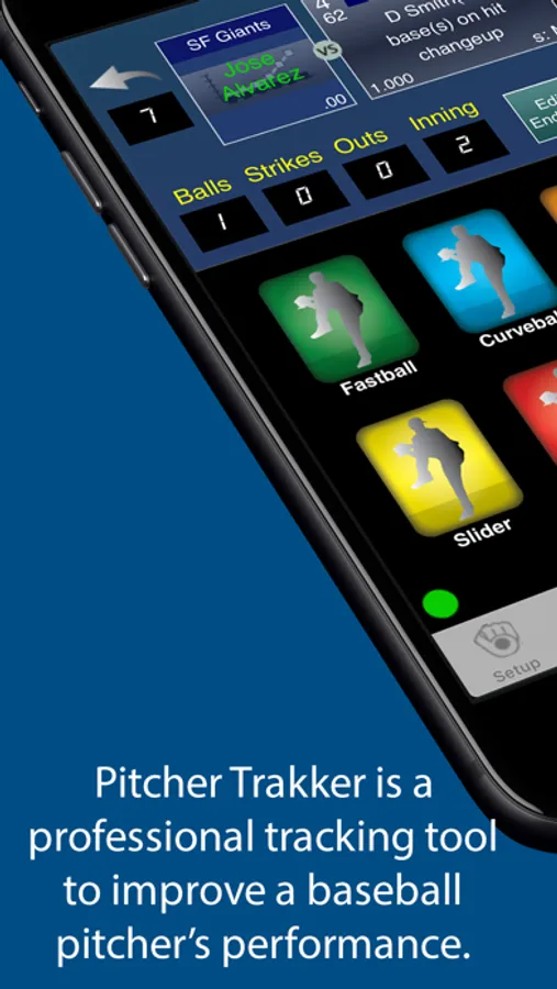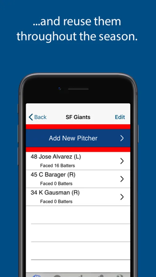 Customize the names of up to 6 pitch-types for each pitcher. Player info is easy to enter and edit and can happen during game play.