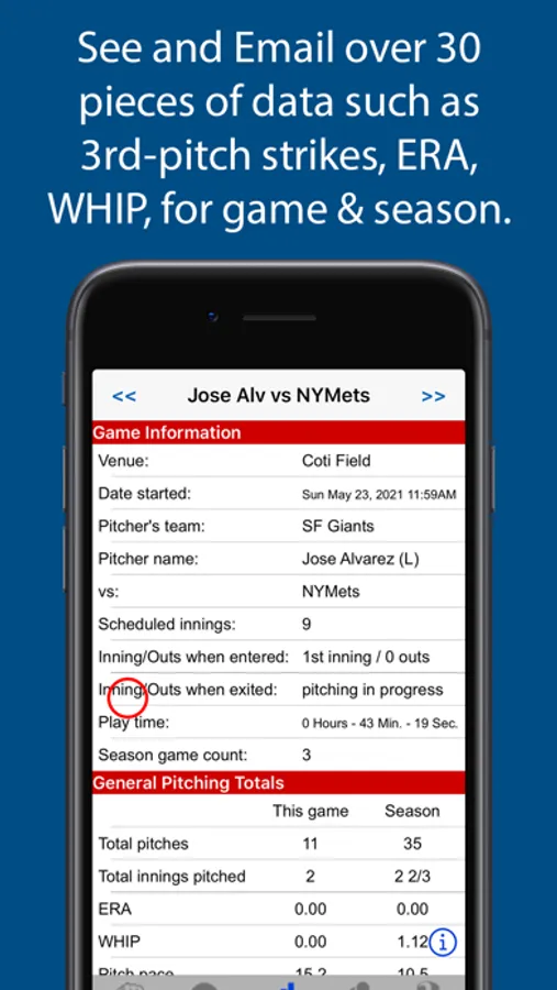 View and email your pitcher's game and seasonal statistics for over 30 pieces of data including called and swinging strikes, ERA, WHIP, 1st pitch strikes, and total pitches. Another 23 line-items cover strike/ball zone and pitch-type data.