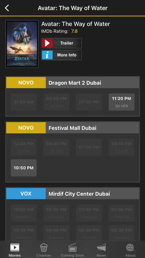 UAE Cinema Showtimes provides movie showtimes and online booking for cinemas across the United Arab Emirates. Trusted by UAE's cinema-goers for over 10 years, it is definitely the only all-in-one app you are going to need. We have got you fully covered by the UAE's best, most comprehensive, elegant and easy to use cinema app.