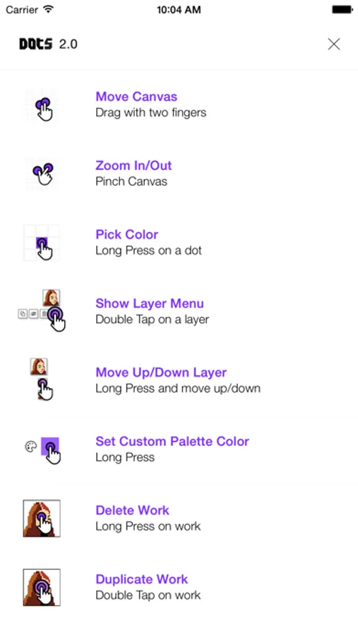 Dots doesn't have complex features. It totally focused on real pixel-art. Select a color and fill dots with it.