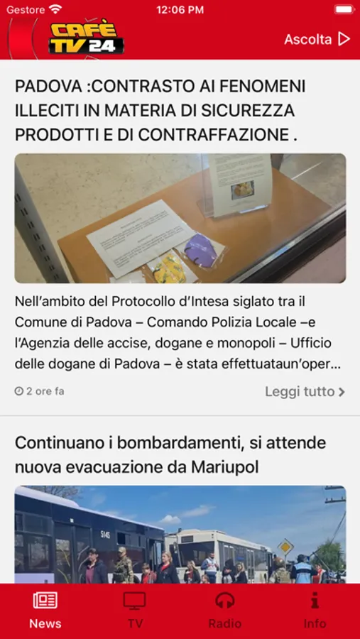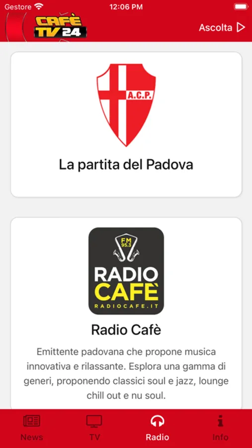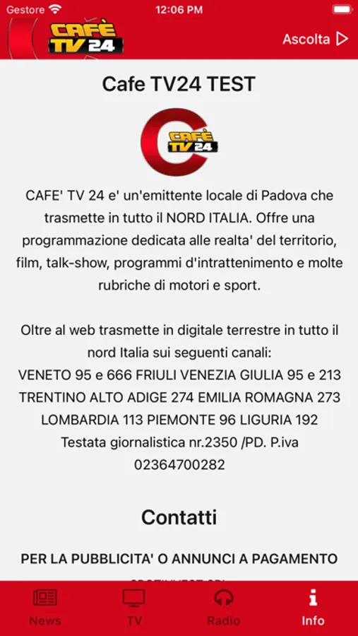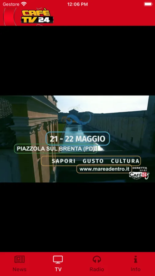 CAFE' TV 24 e' un'emittente locale di Padova che trasmette in tutto il NORD ITALIA. Offre una programmazione dedicata alle realta' del territorio, film, talk-show, programmi d'intrattenimento e molte rubriche di motori e sport.