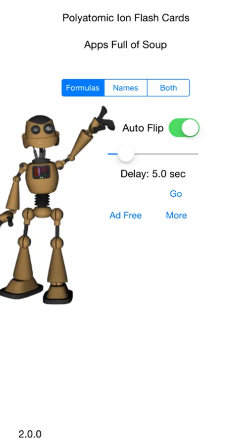Flash Cards with the common polyatomic ions. Helps commit the polyatomic ions to memory, including their molecular formulas and ionic charge. Study by name or formula or both. Go at your own speed or set the timer.