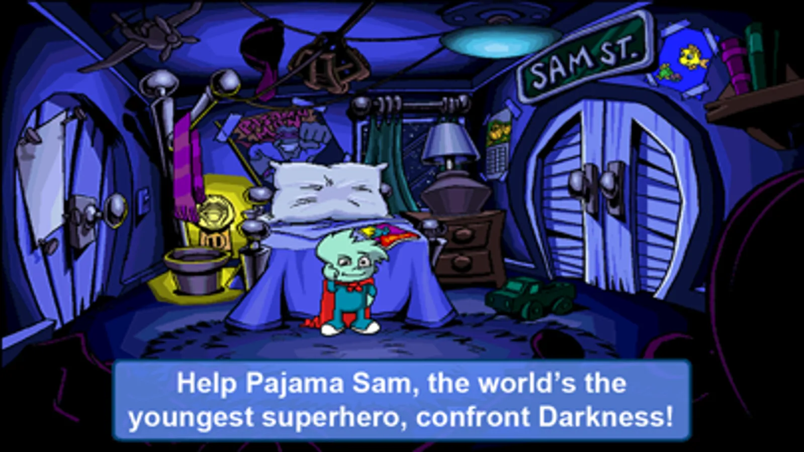 Sam is ready to face his fear of the dark, following his favorite comic book Superhero Pajama Man he takes up the identity of Pajama Sam as he journeys into his imagination to the land of Darkness.
