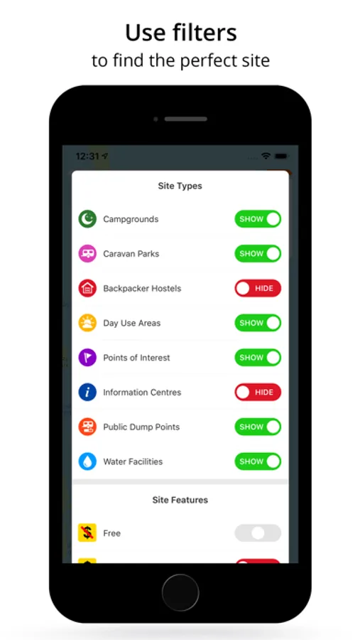 You can also use the site filters to narrow down your results and only show sites relative to your needs. Eg. Must have toilets, must be pet friendly, has power available, etc.