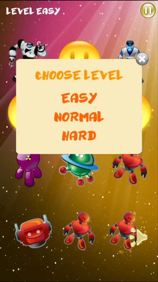 In the Practice game mode, there are three levels to choose from: Easy, Normal and Hard. They vary in terms of the number of robots (3, 4 or 5) whose order of appearance the player must remember. If you choose this game mode, you must remember the order in which robots, shown later on the plates below, appear on the screen. Touch the screen, the plates go blank and you must indicate robots you see in the same order as they appeared on the plates. Easy, isn't it?