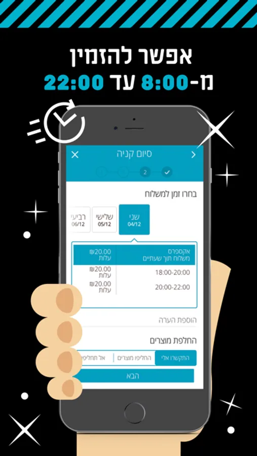 • להזמין משלוח בכל שעה ולקבל מהשעה 8:00 בבוקר ועד 22:00 בלילה.