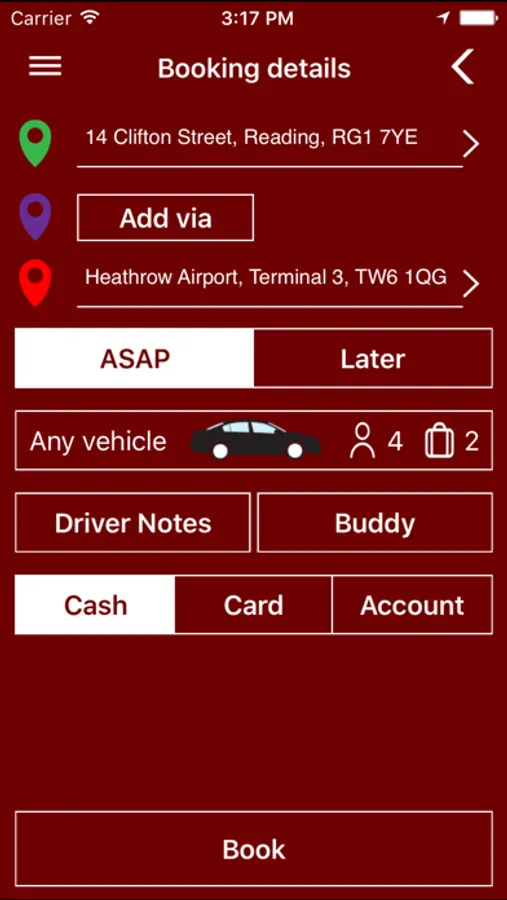 Setting up is easy, simply enter your name, phone number and email address to register. If you wish to register debit/credit card details you can do so, allowing you to complete a journey without paying cash to the driver (Account customers will need to contact the accounts to be set up)