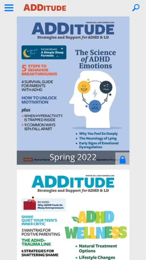 Don’t have a print magazine subscription? Issues within the app can be purchased individually for $4.99 or buy a full year (4 issues) for $19.99. Please note that purchases made within the app are through this app store, and therefore don’t include access to the ADDitude print and digital web browser editions. See full app subscription details below.