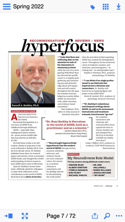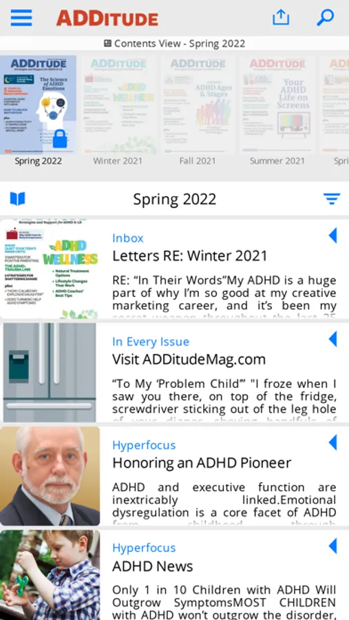 The ADDitude magazine app includes all of the articles in each issue. The issues within the app are available for download and can be read anytime, even offline.