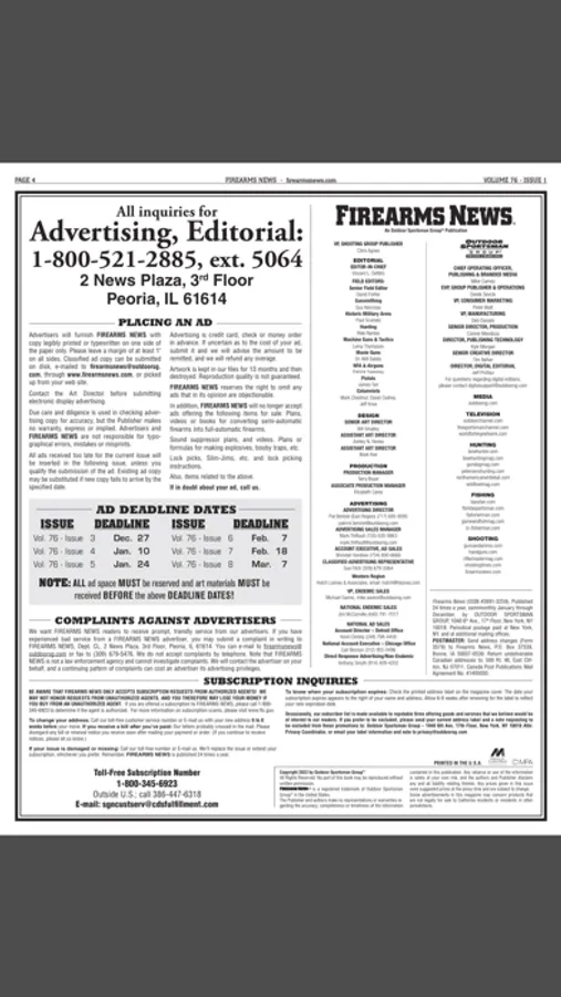 Firearms News is the one and only "paper gun show" in the industry since 1946! If you're serious about buying, selling, collecting, trading, and shooting firearms then Firearms News is for you. Firearms News covers the latest guns for self-defense as well as your Second Amendment protected military-styled firearms. We are unequaled in the publishing industry for reviews of historical military arms of the 20th century and we have some the top gun writers. Firearms News is printed twice per month and each issue is also packed with the latest offerings from gun manufacturers, importers, dealers as well as private collectors. So, if you are into modern sporting rifles, pistols, antique firearms, machine-guns, military surplus, gun parts & accessories, and if you love the Second Amendment, Firearms News is your magazine!